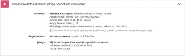 1. Asmens sveikatos priežiūros įstaiga, specialistas ir pacientas. Bloke matoma informacija apie atvykimą registravusią sveikatos priežiūros įstaigą, prisijungusį specialistą bei pacientą. Šie duomenys užpildomi automatiškai pagal prisijungusį naudotoją ir pasirinktą specialistą ir yra neredaguojami.