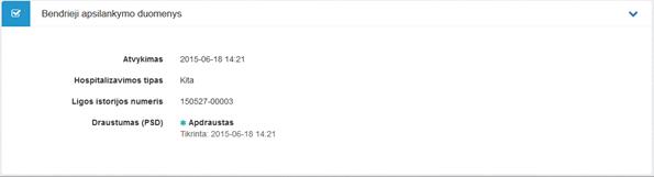 2. Bendrieji apsilankymo duomenys. Bloke matomi atvykimo duomenys, užpildyti kuriant apsilankymą (žr. skyrių 4.8 Apsilankymo registravimas).