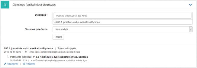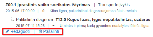 Kol esama tame pačiame lange, kuriame diagnozė buvo pridėta, ir be apribojimų galima redaguoti ir šalinti mygtukais atitinkamai Redaguoti ir Šalinti.