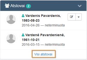 Paciento kortelės puslapyje (žr. skyrių 4.6 Paciento kortelė) iš Atstovai kortelės specialistas gali iškviesti paciento atstovų tvarkymo funkcionalumą: