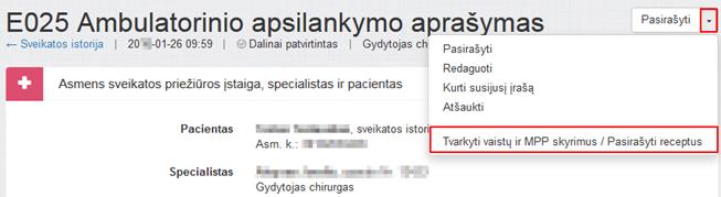 Skiriamų vaisų ar MPP tvarkymo funkcionalumas galima iškviesti iš dalinai patvirtinto E003 ar E025 dokumento peržiūros lango išskleidžiamame meniu pasirinkus punktą Tvarkyti vaistų ir MPP skyrimus / Pasirašyti receptus.