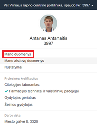Atsidariusiame specialisto duomenų peržiūros puslapyje galima peržiūrėti prisijungusio prie specialistų portalo naudotojo duomenis (žr. skyrių 4.27.1 Peržiūrėti specialisto duomenis) ir iškviesti prisijungusio naudotojo duomenų redagavimo funkcionalumą (žr. skyrių 4.27.2 Redaguoti specialisto duomenis).