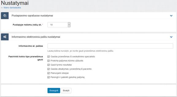 Pakeitus duomenis specialisto informavimo nustatymų puslapyje, galima pasirinkti išsaugoti pakeitimus (Išsaugoti) arba išvalyti puslapyje atliktus pakeitimus (Išvalyti).