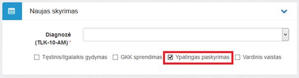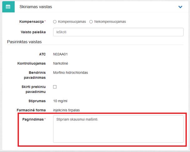 Skiriant vaistą Ypatingu skyrimu, būtina užpildyti privalomą lauką Pagrindimas.